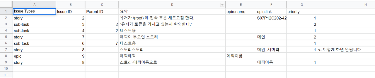 - Issue ID : 이슈의 아이디(엑셀에서 그냥 쭉 넣어주면 된다.) 내부적으로 지정해주고 싶은게 있을 때 쓰는 것.