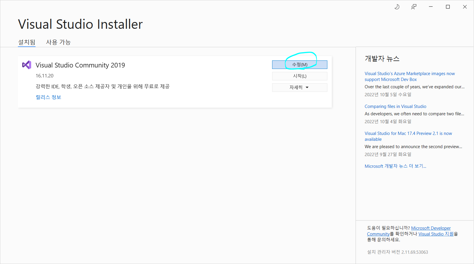 이 설치되어있는지 확인 후 안되어있다면 설치(체크박스 체크 후 수정버튼 클릭)하고 vs code 껐다가 다시 열어보기