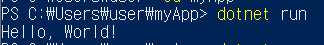 Hello, World!가 출력되면 dotnet이 활성화된 것.